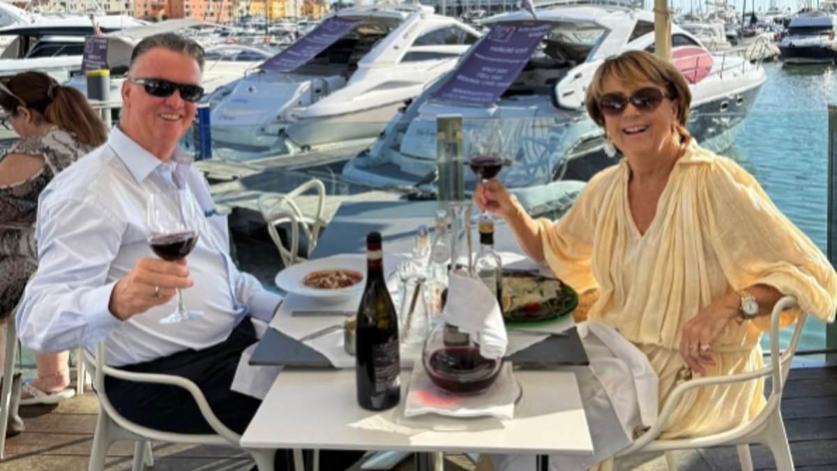 La pareja, que posee una casa de vacaciones cerca de Albufeira, Algarve, sonreía mientras cada uno sostenía un vaso de vino tinto a la cámara, sentados y cenando en un restaurante con gafas de sol.
