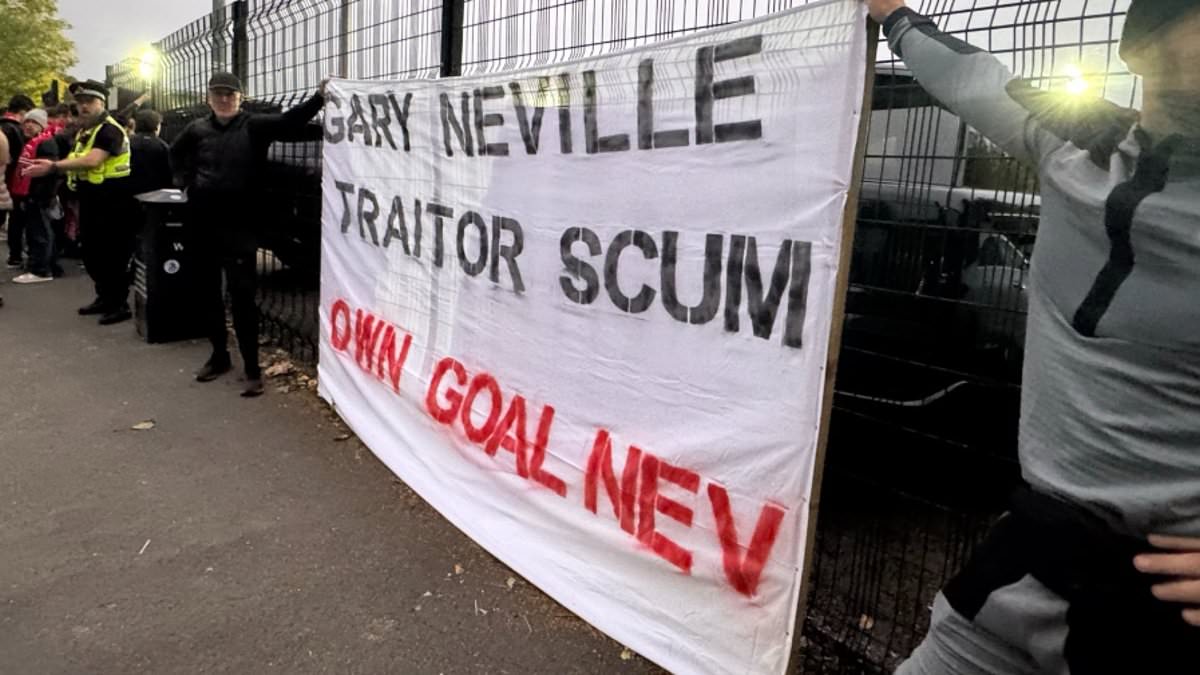 Neville’s flagship hotel and football club were targeted by fans on Tuesday evening, who held a banner and tied Union Jack flags to nearby lamposts