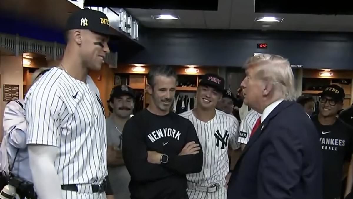 Footage captured inside the locker room depicted Trump at ease, sharing laughter and exchanges with Yankees players before he spoke to them, claiming personal attendance at a loss-free game of theirs.