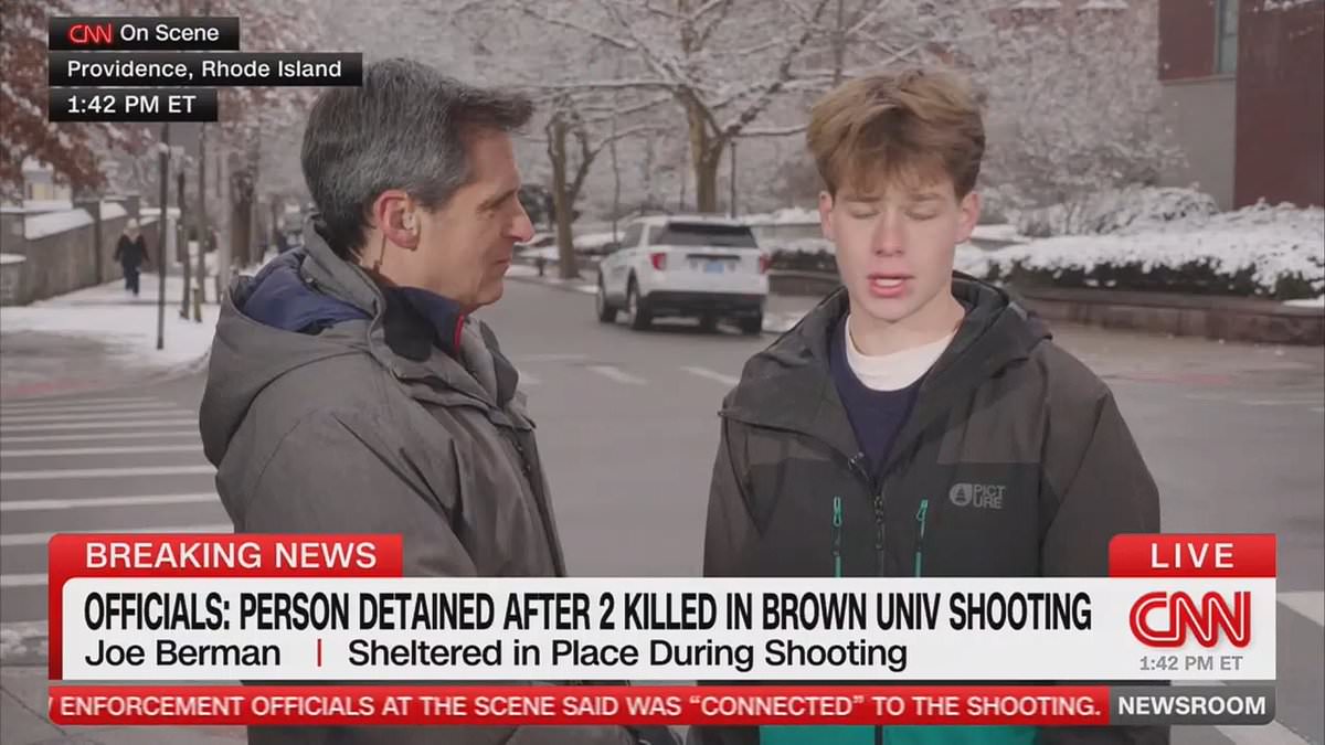 A CNN anchor whose son was locked inside Brown University during last night's deadly mass shooting left viewers emotional as he hugged him live on air. John Berman embraced his son Joe after the teenager recounted the harrowing experience in an interview with his journalist father. Joe said that he had just arrived at the library to meet a friend when he found out about the shooting a short distance away. He was signing an entrance form because he is not a Brown student and was visiting the campus. Joe said: 'Right in front of us, talking to a different library clerk, was a woman who was very sad on the phone. Her friend had just seen someone lying on the ground and said they had to call 911.