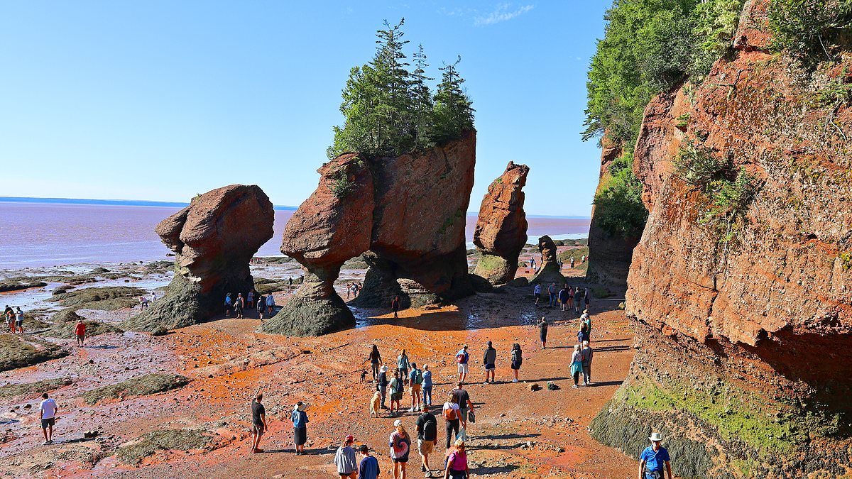 Among the bay’s most captivating sights are the Hopewell Rocks, also known as the Flowerpot Rocks. These towering formations, which visitors can walk around at low tide, are completely submerged just a few hours later when the tide rolls back in.