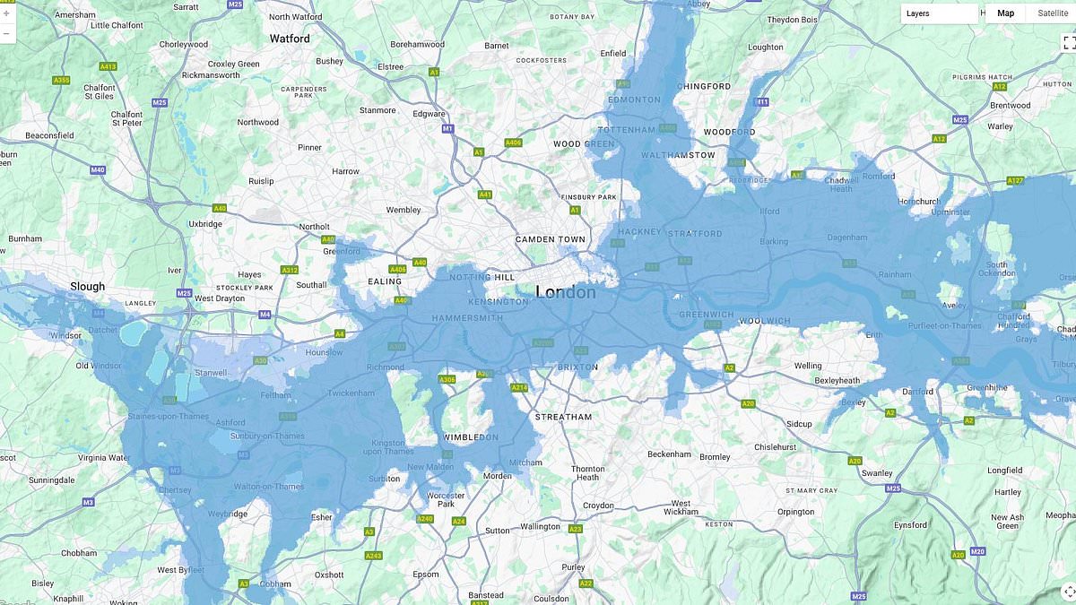 In London, tidal flooding will extend as far as Peckham in the south and Barking in the north.