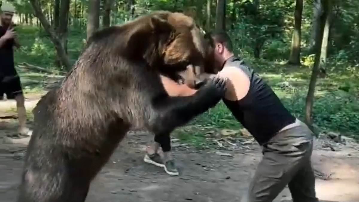 Makhmudov, who will face Tyson Fury at Tottenham Hotspur Stadium in April, can be seen wrestling the bear as it attempted to lock its jaw down on his arm in preparation for the bout